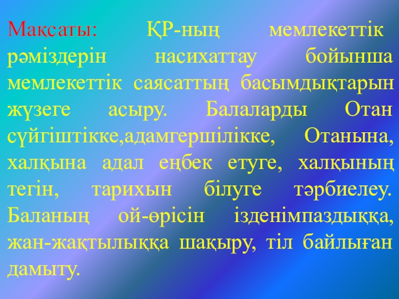 Слайд 2Мақсаты: ҚР-ның мемлекеттік рәміздерін насихаттау бойынша мемлекеттік саясаттың басымдықтарын жүзеге асыру.
