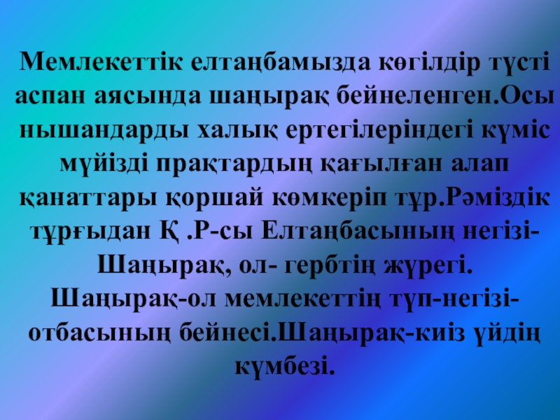Слайд 13Мемлекеттік елтаңбамызда көгілдір түсті аспан аясында шаңырақ бейнеленген.Осы нышандарды халық ертегілеріндегі