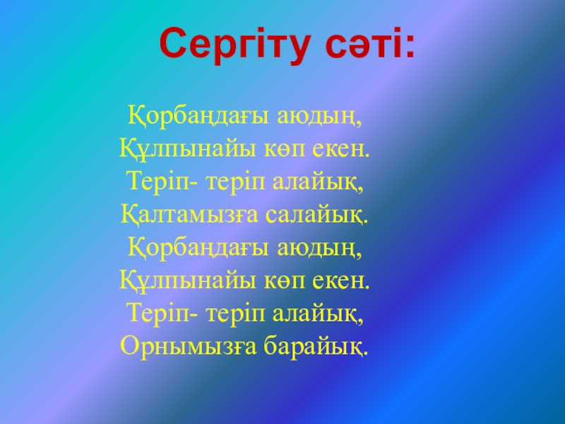 Сергіту сәті:Қорбаңдағы аюдың,Құлпынайы көп екен.Теріп- теріп алайық,Қалтамызға салайық.Қорбаңдағы аюдың,Құлпынайы көп екен.Теріп- теріп алайық,Орнымызға барайық.