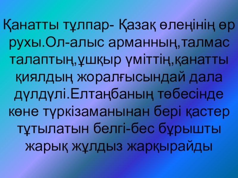 Қанатты тұлпар- Қазақ өлеңінің өр рухы.Ол-алыс арманның,талмас талаптың,ұшқыр үміттің,қанатты қиялдың жоралғысындай дала дүлдүлі.Елтаңбаның төбесінде көне түркізаманынан бері