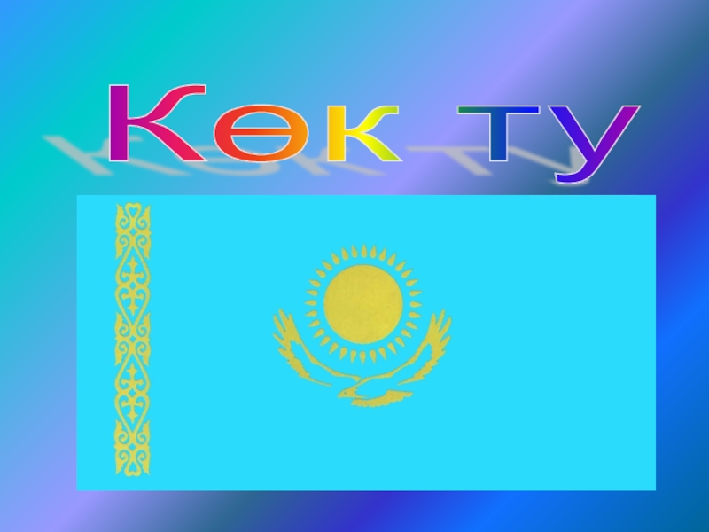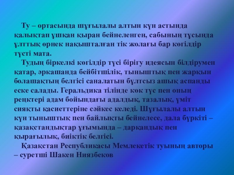 Слайд 7Ту – ортасында шұғылалы алтын күн астында қалықтап ұшқан қыран бейнеленген,