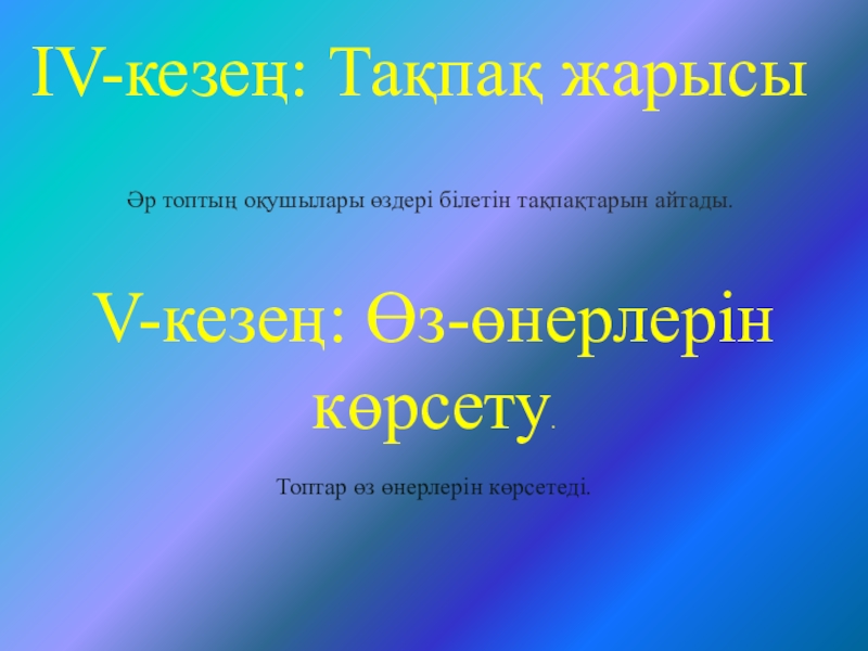 IV-кезең: Тақпақ жарысыӘр топтың оқушылары өздері білетін тақпақтарын айтады.V-кезең: Өз-өнерлерін көрсету.Топтар өз өнерлерін көрсетеді.