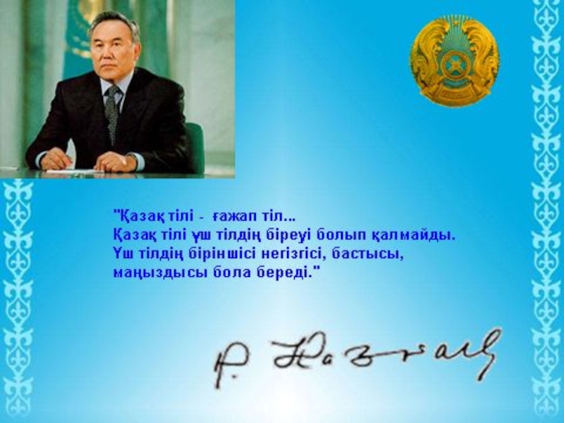 – Гимн. 2006 жылы 7 қаңтарда Қазақстан Республикасының жаңа Мемлекеттік Гимні қабылданды. Гимннің сөзін жазғандар - Жұмекен Нәжімеденов пен Нұрсұлтан Назарбаев. Ал әнін жазған – белгілі сазгер Шәмші Қалдаяқов. Гимнді жатқа білу – әрбіріміздің парызымыз!