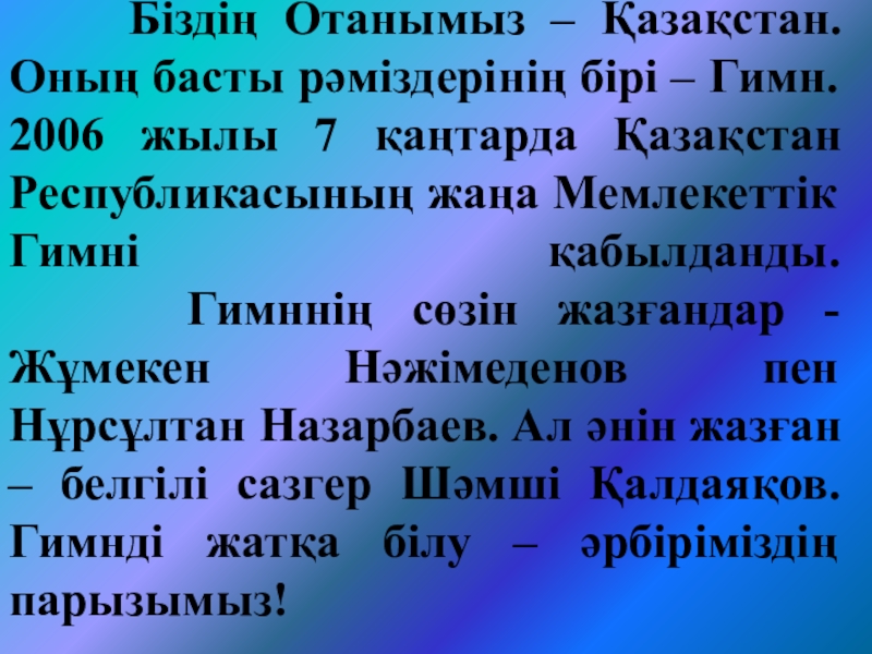 Біздің Отанымыз – Қазақстан. Оның басты рәміздерінің бірі – Гимн. 2006 жылы 7 қаңтарда
