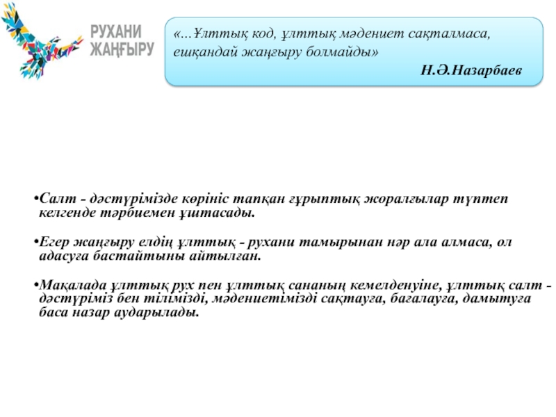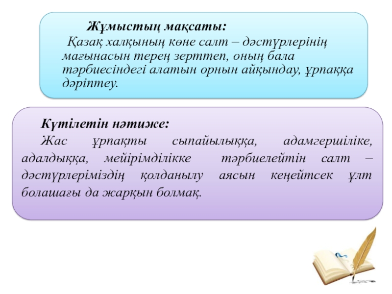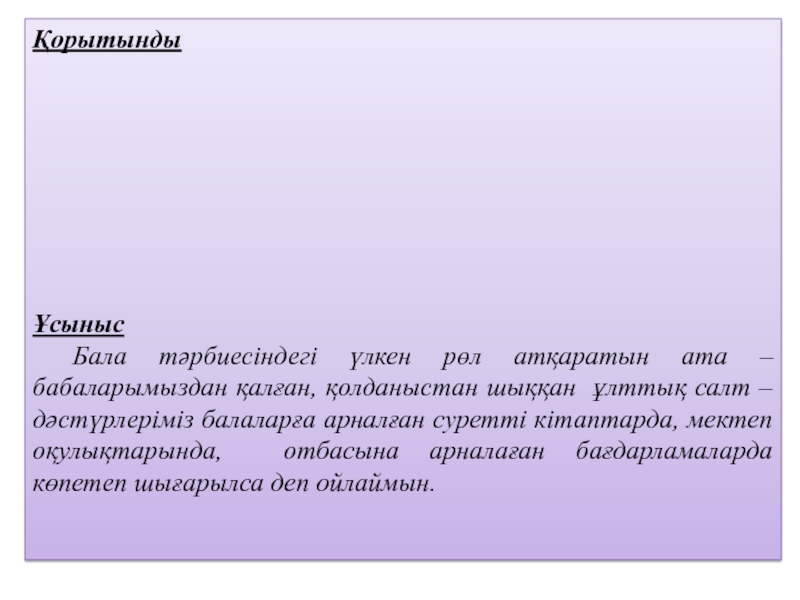 Жас ұрпақты сыпайылыққа, адамгершіліке, адалдыққа, мейірімділікке тәрбиелейтін салт – дәстүрлеріміздің қолданылу аясын кеңейтсек ұлт болашағы да жарқын болмақ.