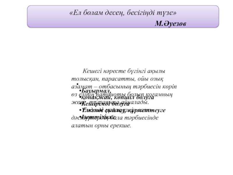 Кешегі нәресте бүгінгі ақылы толысқан, парасатты, ойы озық азамат – отбасының тәрбиесін көріп өз елінің патриоты болып қоғамның жеке тұлғасына айналады.