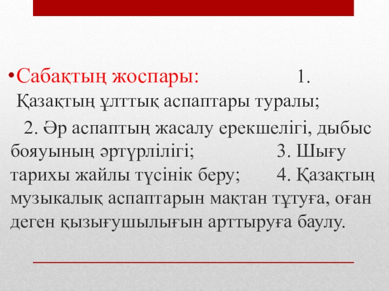 Слайд 2Сабақтың жоспары: 1. Қазақтың ұлттық аспаптары туралы;