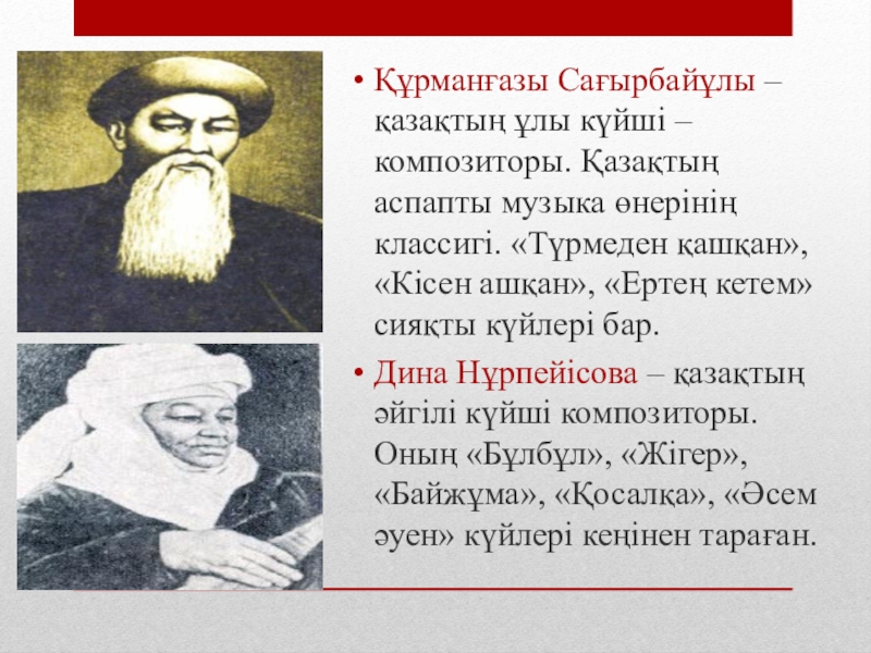 Слайд 5Құрманғазы Сағырбайұлы – қазақтың ұлы күйші – композиторы. Қазақтың аспапты музыка