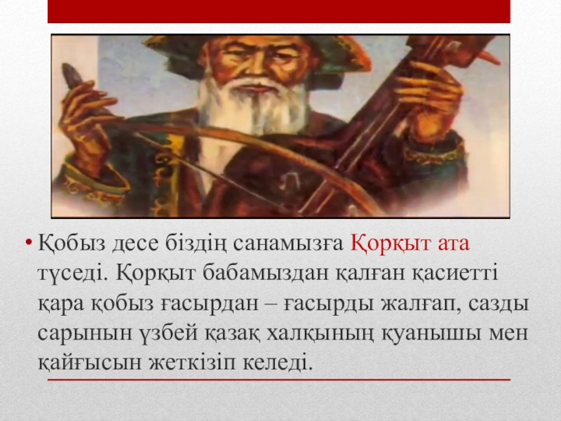 Слайд 15Қобыз десе біздің санамызға Қорқыт ата түседі. Қорқыт бабамыздан қалған қасиетті