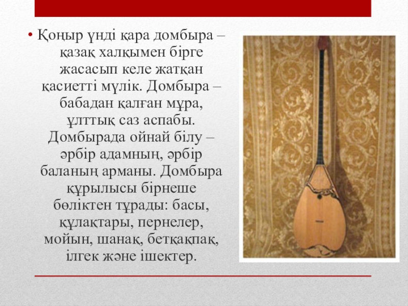 Слайд 4Қоңыр үнді қара домбыра –қазақ халқымен бірге жасасып келе жатқан қасиетті