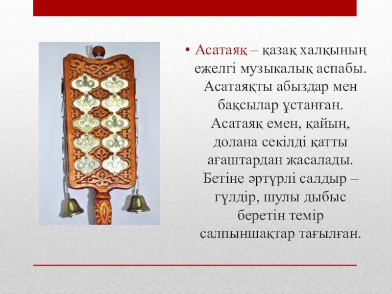 Слайд 18Асатаяқ – қазақ халқының ежелгі музыкалық аспабы. Асатаяқты абыздар мен бақсылар
