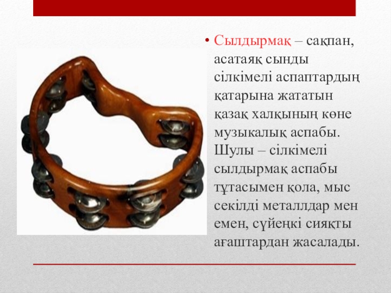 Слайд 16Сылдырмақ – сақпан, асатаяқ сынды сілкімелі аспаптардың қатарына жататын қазақ халқының