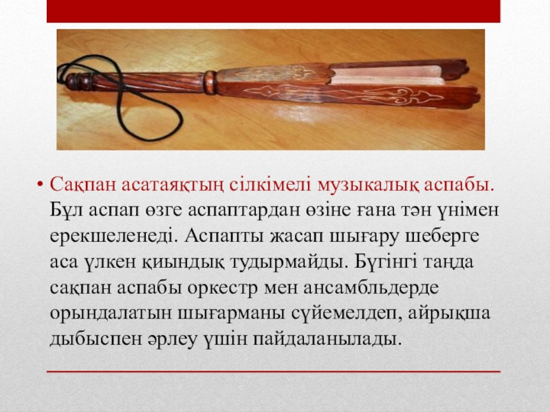 Слайд 19Сақпан асатаяқтың сілкімелі музыкалық аспабы. Бұл аспап өзге аспаптардан өзіне ғана