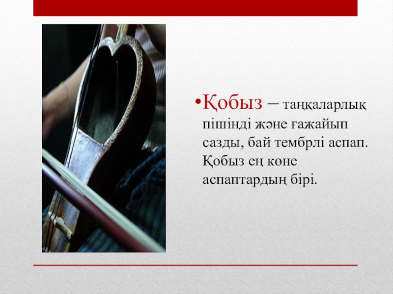 Слайд 12Қобыз – таңқаларлық пішінді және ғажайып сазды, бай тембрлі аспап. Қобыз
