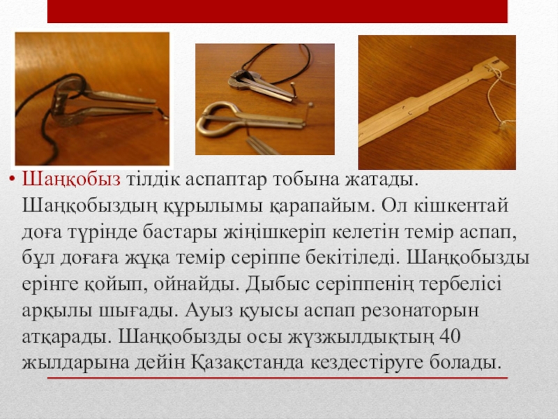 Слайд 14Шаңқобыз тілдік аспаптар тобына жатады. Шаңқобыздың құрылымы қарапайым. Ол кішкентай доға