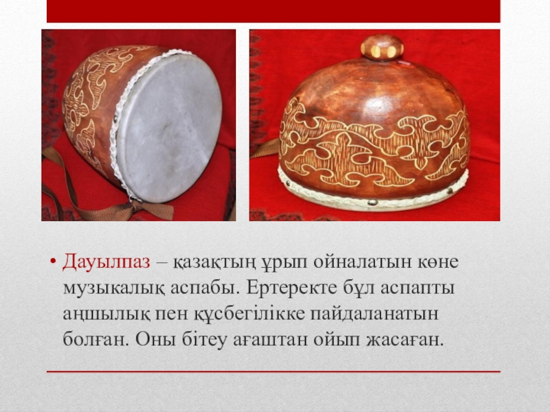 Слайд 17Дауылпаз – қазақтың ұрып ойналатын көне музыкалық аспабы. Ертеректе бұл аспапты
