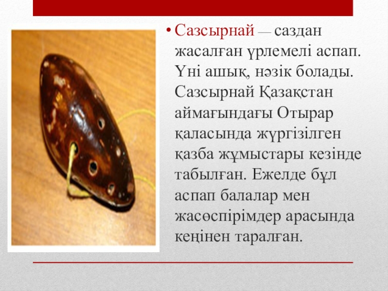 Слайд 11Сазсырнай — саздан жасалған үрлемелі аспап. Үні ашық, нәзік болады. Сазсырнай