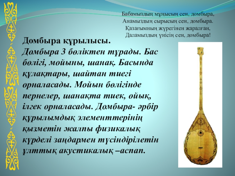 Домбыра 3 бөліктен тұрады. Бас бөлігі, мойыны, шанақ. Басында құлақтары, шайтан тиегі орналасады. Мойын бөлігінде пернелер, шанақта тиек, ойық, ілгек орналасады. Домбыра- әрбір құрылымдық элементтерінің қызметін жалпы физикалық күрделі заңдармен түсіндірілетін ұлттық акустикалық –аспап.