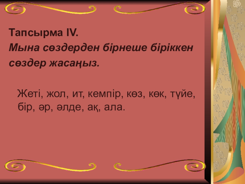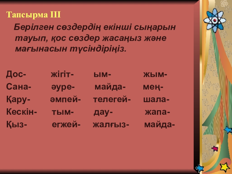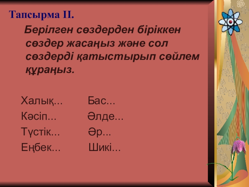 Берілген сөздерден біріккен сөздер жасаңыз және сол