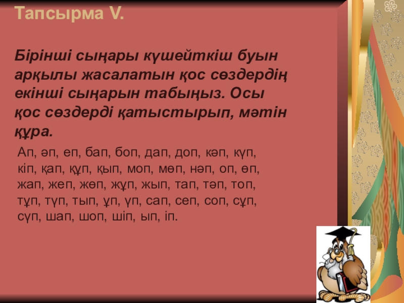 көз, көк, түйе, бір, әр, әлде, ақ, ала.