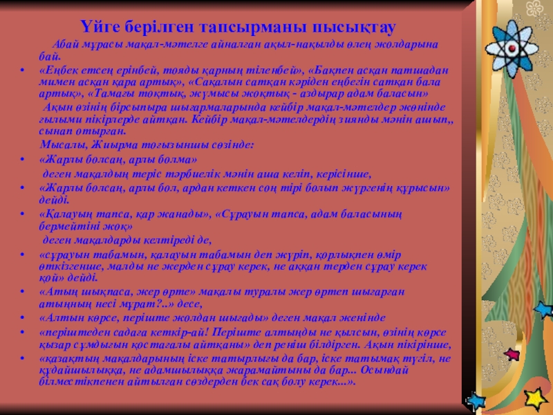 Абай мұрасы мақал-мәтелге айналған ақыл-нақылды өлең жолдарына бай.