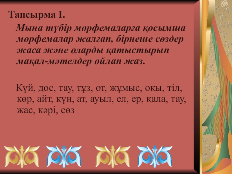 Мына түбір морфемаларға қосымша морфемалар жалғап, бірнеше сөздер