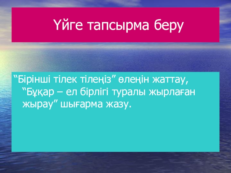 Үйге тапсырма беру “Бірінші тілек тілеңіз” өлеңін жаттау, “Бұқар – ел бірлігі