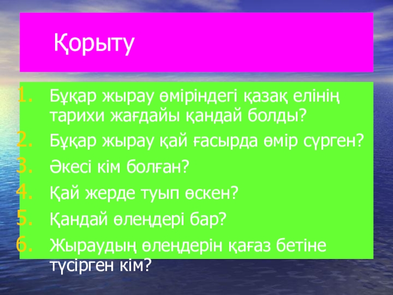 ҚорытуБұқар жырау өміріндегі қазақ елінің тарихи жағдайы қандай болды?Бұқар жырау қай ғасырда өмір сүрген?Әкесі кім