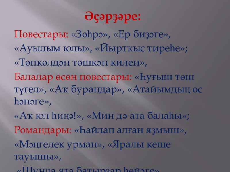 Проза әҫәрҙәре: «Өс таған», «Беҙҙең өйҙөң йәме», «Оҙон-оҙаҡ бала саҡ», «Ярлыҡау» һ.б.