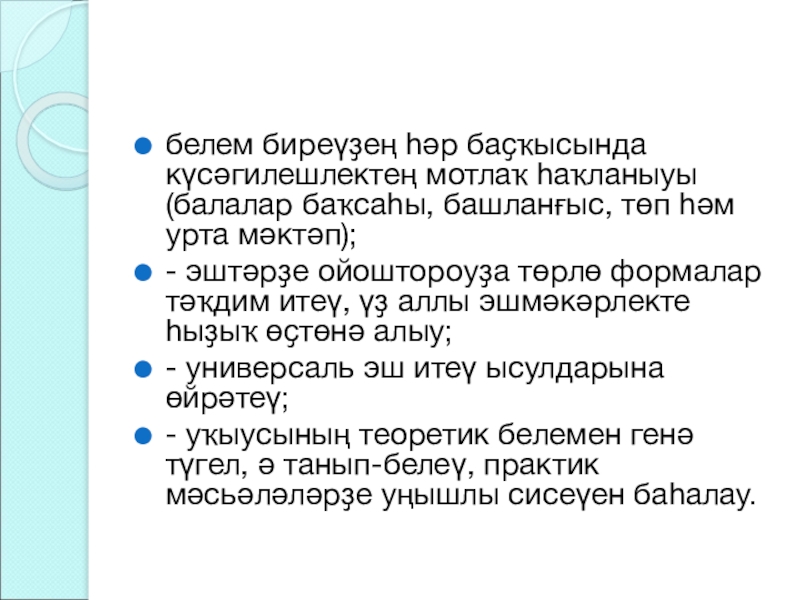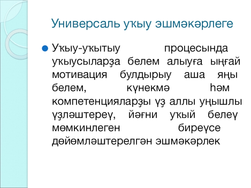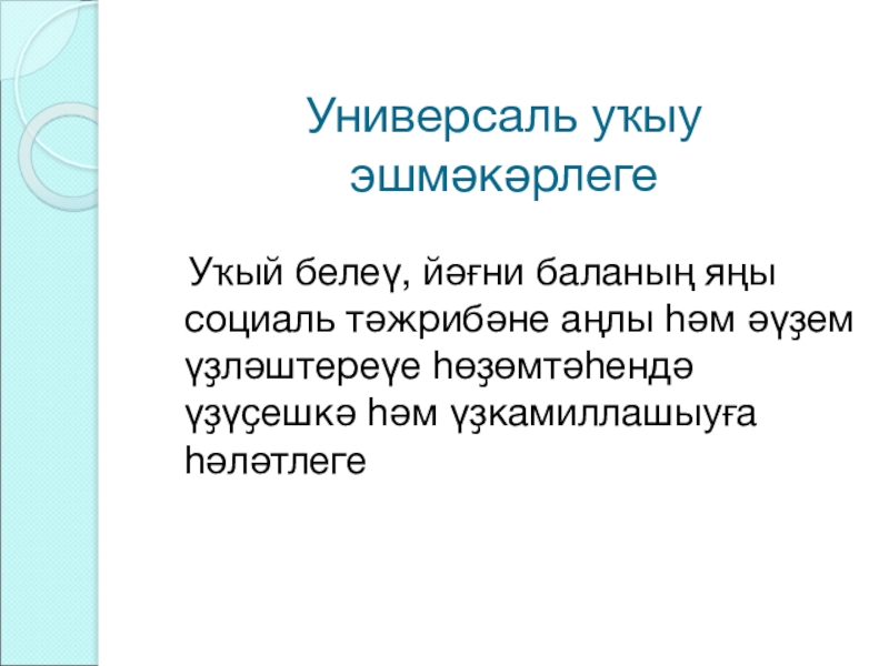 универсаль уҡыу күнекмәләре аша донъяны танып белеүе, билдәле компетенцияларға эйә булыуы һәм белем биреүҙең һөҙөмтәгә йүнәлтелеүе ;