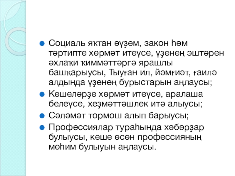 ҡиммәттәргә ярашлы башҡарыусы, Тыуған ил, йәмғиәт, ғаилә алдында үҙенең бурыстарын аңлаусы;
