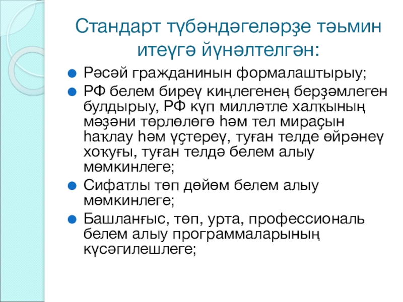 Слайд 4Стандарт түбәндәгеләрҙе тәьмин итеүгә йүнәлтелгән: