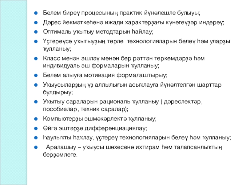 - эштәрҙе ойоштороуҙа төрлө формалар тәҡдим итеү, үҙ аллы эшмәкәрлекте һыҙыҡ өҫтөнә алыу;