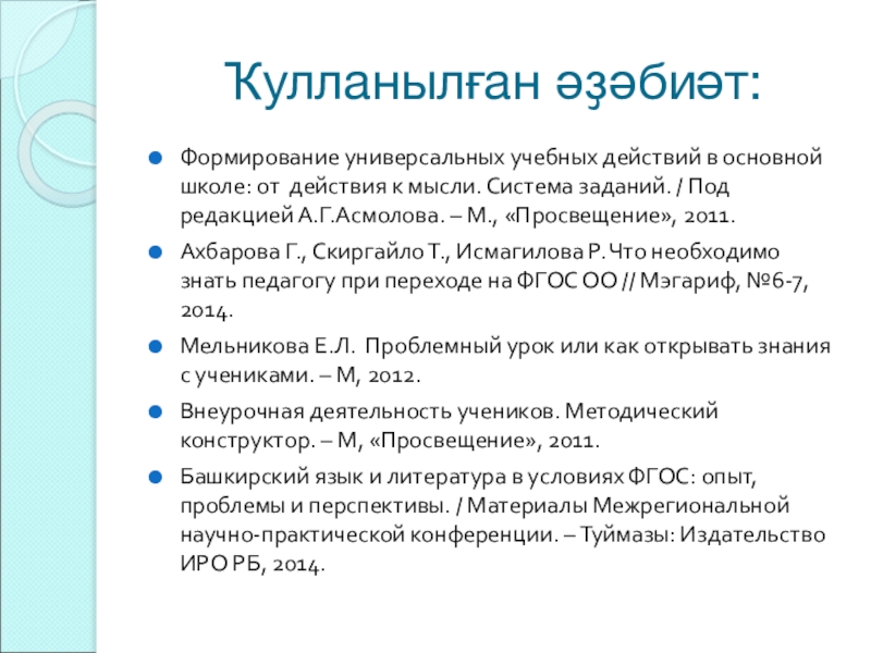 Башкирский язык и литература в условиях ФГОС: опыт, проблемы и перспективы. / Материалы Межрегиональной научно-практической конференции. – Туймазы: Издательство ИРО РБ, 2014.