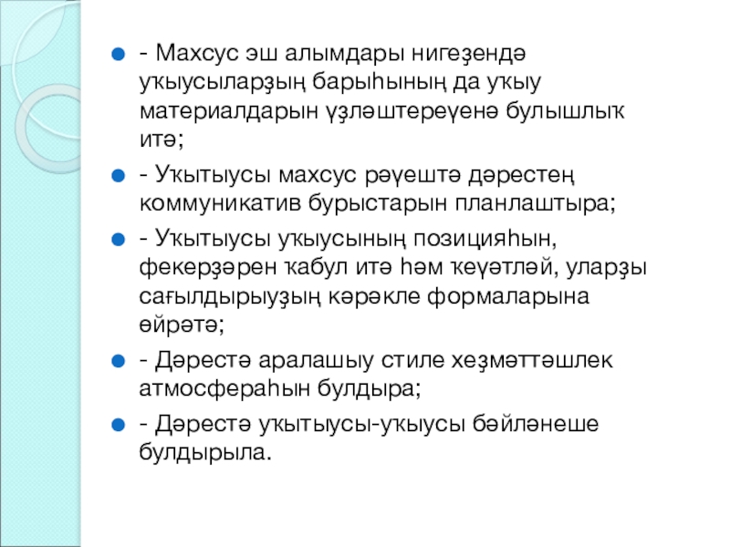 эшмәкәрлек төрҙәрен, аралашыу формаларын уҡыусыларҙың шәхси һәм йәш үҙенсәлектәренән сығып һайлау, уларҙың шәхес булараҡ үҫешен тәьмин итеү;