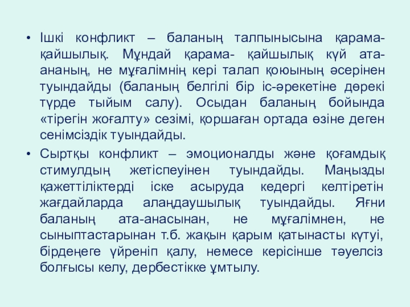 Слайд 7Ішкі конфликт – баланың талпынысына қарама-қайшылық. Мұндай қарама- қайшылық күй ата-ананың,