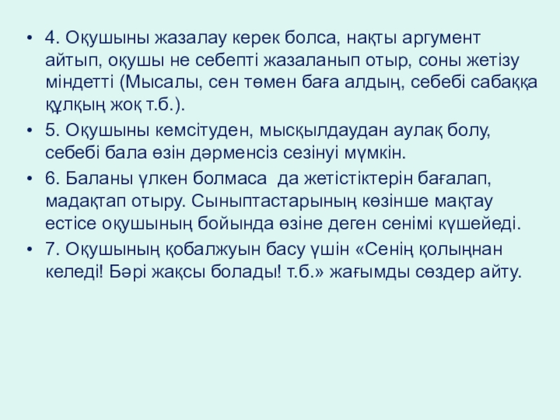 Слайд 94. Оқушыны жазалау керек болса, нақты аргумент айтып, оқушы не себепті