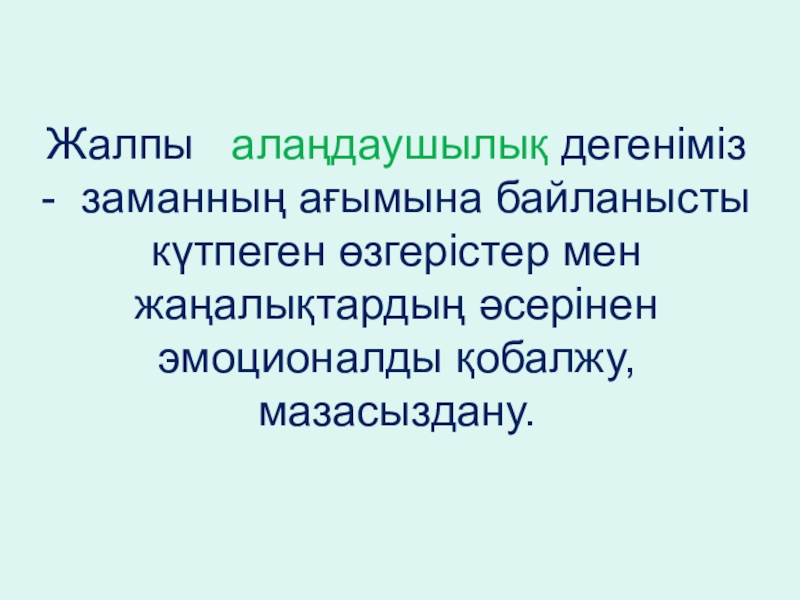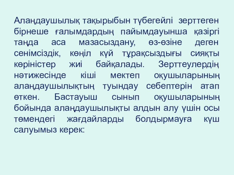 Слайд 6Алаңдаушылық тақырыбын түбегейлі зерттеген бірнеше ғалымдардың пайымдауынша қазіргі таңда аса мазасыздану,