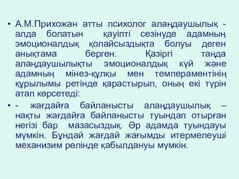 Слайд 4А.М.Прихожан атты психолог алаңдаушылық - алда болатын қауіпті сезінуде адамның эмоционалдық