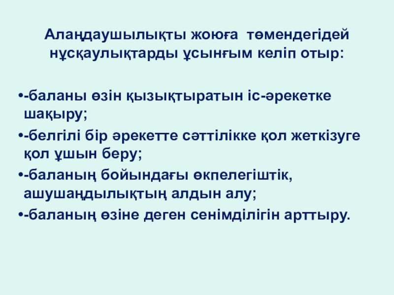 Слайд 10Алаңдаушылықты жоюға төмендегідей нұсқаулықтарды ұсынғым келіп отыр: