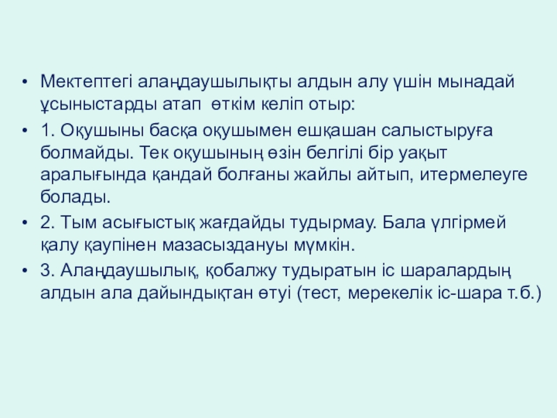 Мектептегі алаңдаушылықты алдын алу үшін мынадай ұсыныстарды атап өткім келіп отыр: