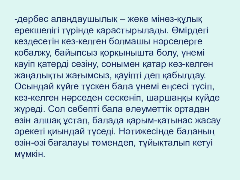 болмашы нәрселерге қобалжу, байыпсыз қорқынышта болу, үнемі қауіп қатерді сезіну, сонымен қатар кез-келген жаңалықты жағымсыз, қауіпті деп қабылдау. Осындай күйге түскен бала үнемі еңсесі түсіп, кез-келген нәрседен сескеніп, шаршаңқы күйде жүреді. Сол себепті бала әлеуметтік ортадан өзін алшақ ұстап, балада қарым-қатынас жасау әрекеті қиындай түседі. Нәтижесінде баланың өзін-өзі бағалауы төмендеп, тұйықталып кетуі мүмкін.