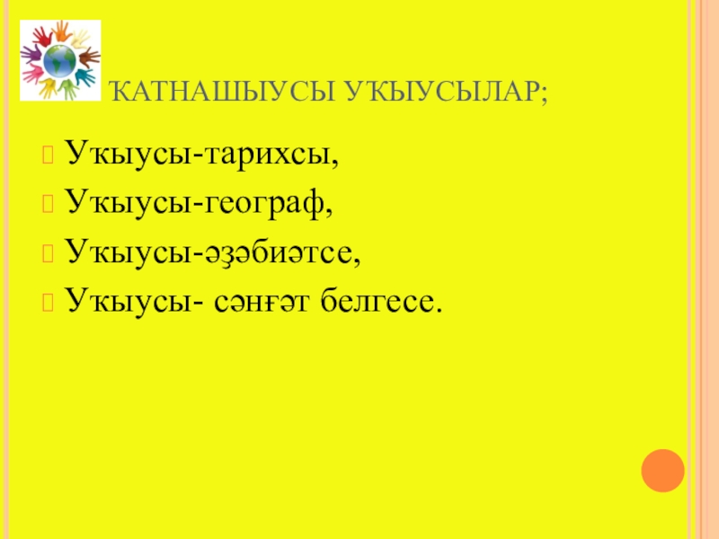 Слайд 4ҠАТНАШЫУСЫ УҠЫУСЫЛАР;