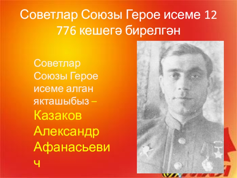 Советлар Союзы Герое исеме 12 776 кешегә бирелгәнСоветлар Союзы Герое исеме алган якташыбыз – Казаков Александр Афанасьевич