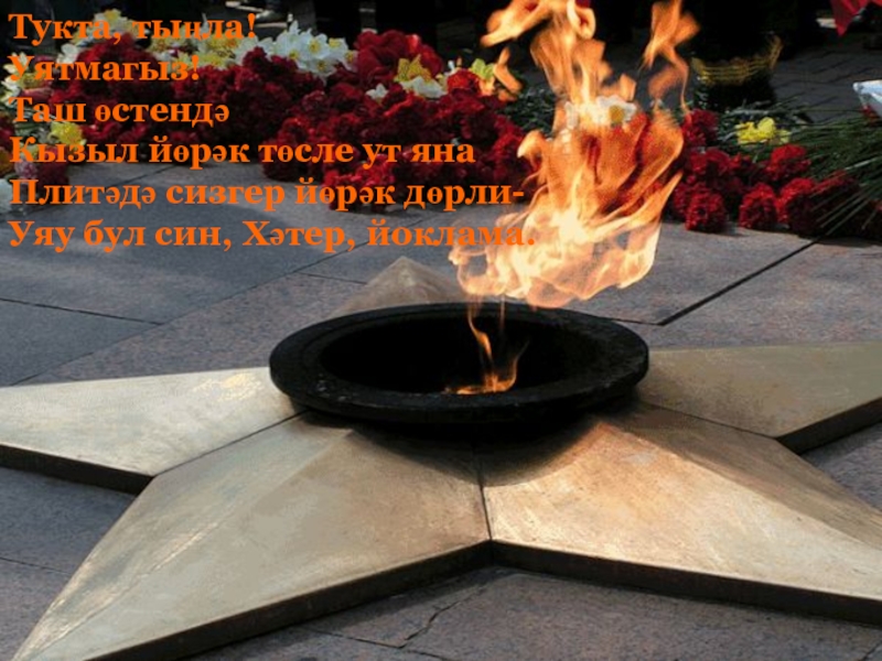 Тукта, тыңла!Уятмагыз!Таш өстендәКызыл йөрәк төсле ут янаПлитәдә сизгер йөрәк дөрли-Уяу бул син, Хәтер, йоклама.