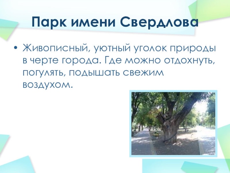 Парк имени СвердловаЖивописный, уютный уголок природы в черте города. Где можно отдохнуть, погулять, подышать свежим воздухом.