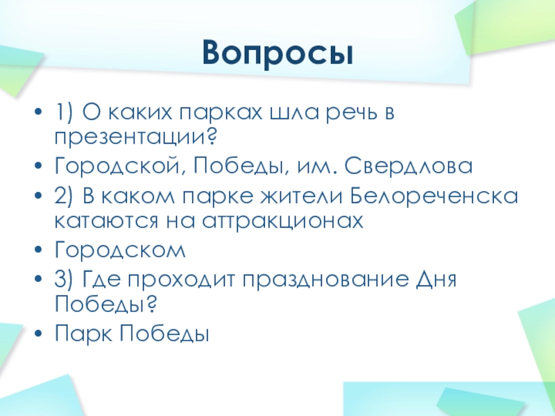 Вопросы1) О каких парках шла речь в презентации?Городской, Победы, им. Свердлова2) В каком парке жители Белореченска катаются