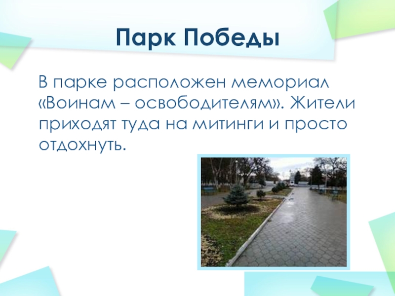 Парк Победы  В парке расположен мемориал «Воинам – освободителям». Жители приходят туда на митинги и просто