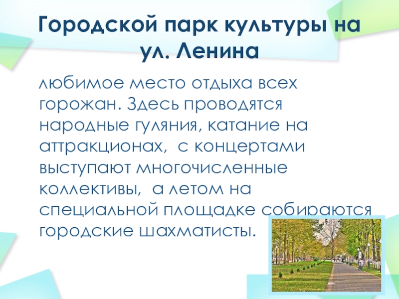 Городской парк культуры на ул. Ленина  любимое место отдыха всех горожан. Здесь проводятся народные гуляния, катание на