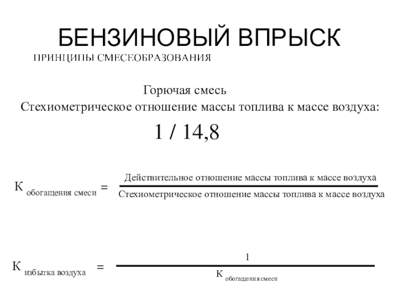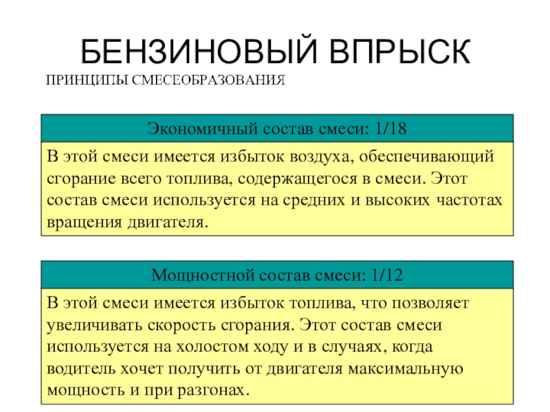 В этой смеси имеется избыток топлива, что позволяет увеличивать скорость сгорания. Этот состав смеси используется на холостом ходу и в случаях, когда водитель хочет получить от двигателя максимальную мощность и при разгонах.